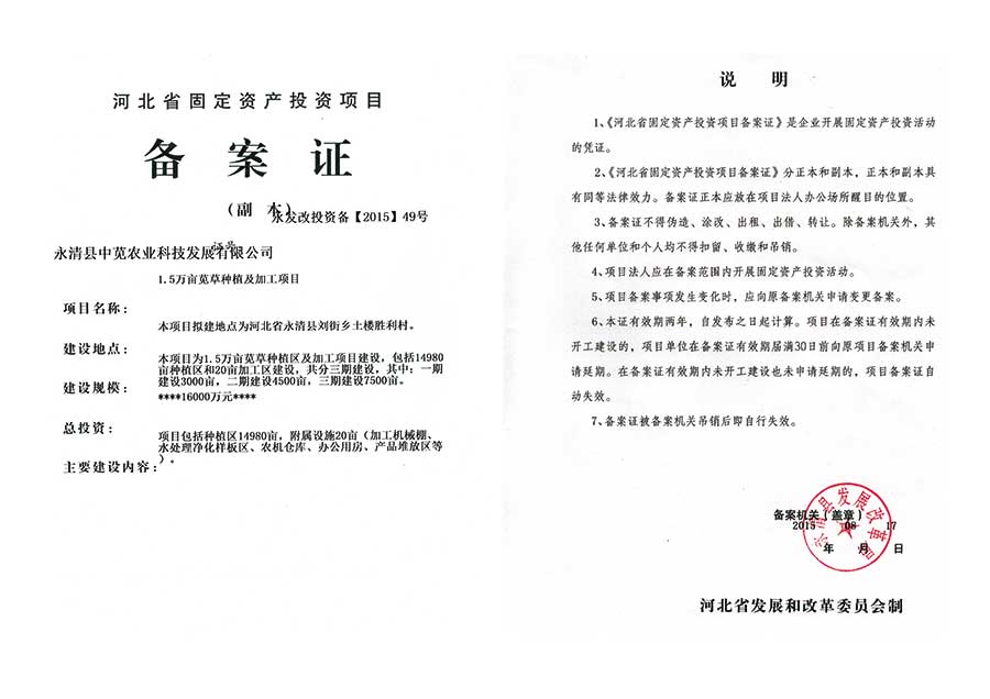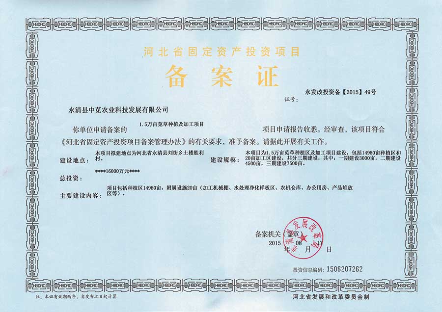 在2015年河北、河南两省基地重点建设取得成功的基础上,我们将在河北永清加大投资,扩大为1.5万亩的直营种植与养殖相结合的重点基地和示范区,该计划已得到河北省发改委的批准。