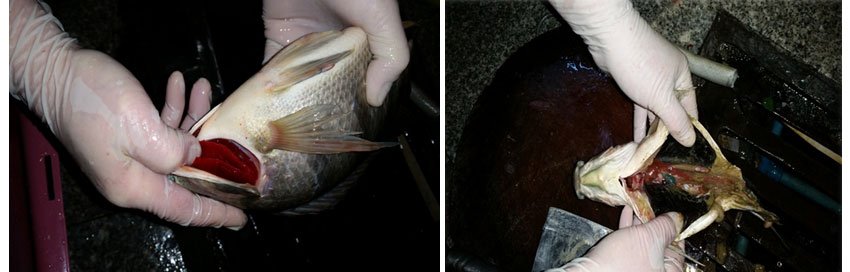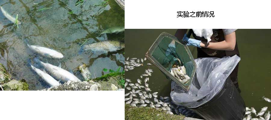 试验用四大家鱼。试验三组鱼塘水产养殖水域面积共计203亩,2013年9月5日至2013年9月16日平均死鱼300至450斤不等,水体发黑偏红。试验开始使用后改善水质提高孵化率,在鲫鱼、草鱼、鲢、鳙等在亲鱼与卵孵化过程中,使用可提高孵化率20%左右。